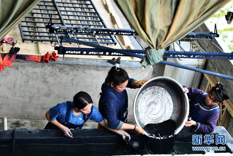 2018年,楊成蘭在村里成立傳統(tǒng)織染合作社,吸引村里及周邊村寨貧困戶入股,帶動當(dāng)?shù)刎毨艉痛迕窦尤牒献魃纾瑥氖驴棽?、染布、藍靛種植等產(chǎn)業(yè),在傳承民族傳統(tǒng)手工技藝的同時,幫助村民脫貧增收。新華社記者楊文斌攝