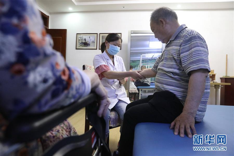 6月1日,在正定縣塔元莊村勁松老年公寓,醫(yī)護(hù)人員為老人做康復(fù)按摩。新華社記者朱旭東攝。