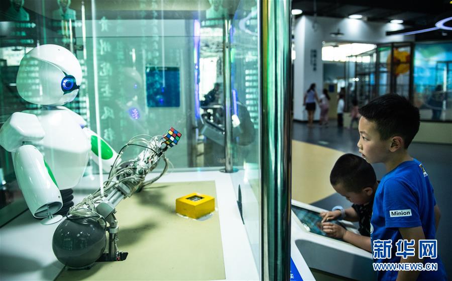 6月1日,小朋友在貴州科技館內(nèi)操作機(jī)器人旋轉(zhuǎn)魔方。新華社記者陶亮攝。