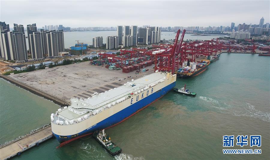 滾裝貨船“勞拉”輪駛?cè)牒?谛阌⒏郏@是海南自貿(mào)區(qū)政策實(shí)施以來的首艘汽車外貿(mào)船(2月16日攝,無人機(jī)照片)。新華社記者楊冠宇攝