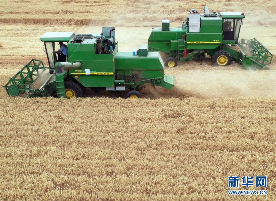 6月2日,在河南省黃泛區(qū)農(nóng)場九分場的麥田里,農(nóng)民操作大型收割機(jī)收獲小麥(無人機(jī)照片)。新華社記者李嘉南攝。