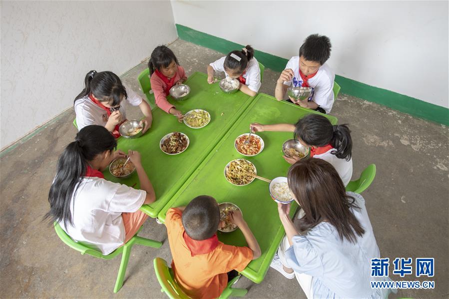 6月2日,馬武寨寄宿制小學的學生們和老師在食堂內(nèi)吃飯。新華社記者楊晨光攝。