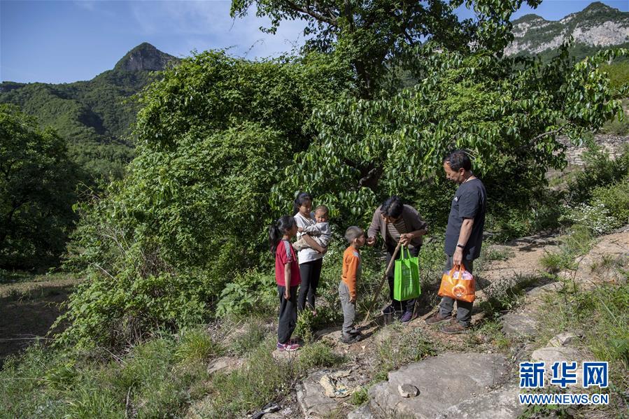 秦春蘭(左二)、秦秋蘭(左一)和秦興旺(右三)在南背村迎接老師們的到來(5月31日攝)。新華社記者楊晨光攝。