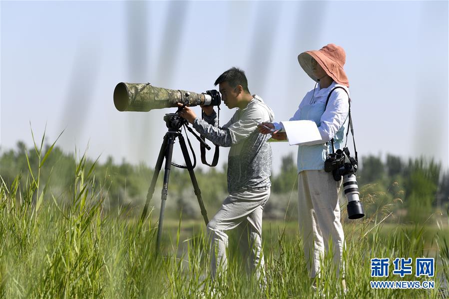 6月3日,李學(xué)明(左)和同事張海榮在監(jiān)測(cè)記錄黃河濕地的鳥類活動(dòng)。新華社記者馮開華攝。