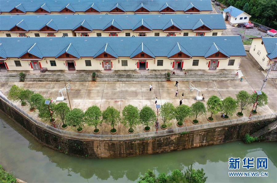 6月3日,人們在永州市新田縣兩江口村易地搬遷集中安置點打籃球(無人機(jī)照片)。新華社記者趙眾志攝。