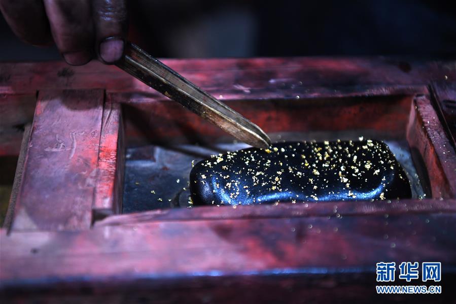 5月21日,安徽歙縣“項氏徽墨”的工人在墨胚上灑金。新華社記者張端攝。