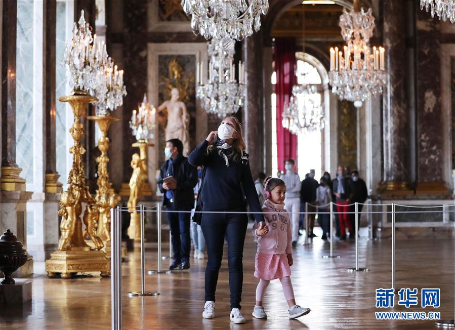 6月6日,一名游客戴著口罩在法國巴黎近郊凡爾賽宮的鏡廳內(nèi)參觀游覽。 新華社記者 高靜 攝