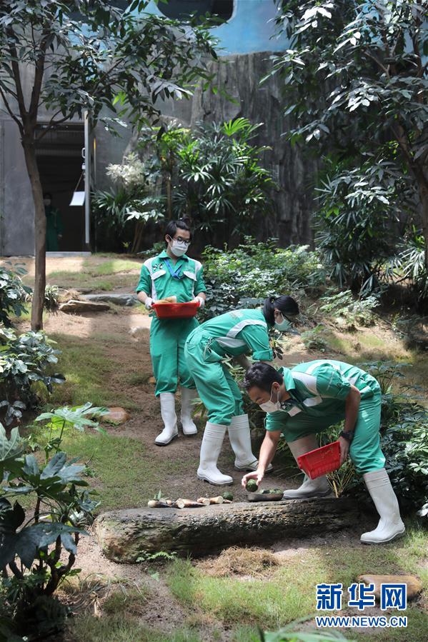 香港海洋公園的工作人員給大熊貓“安安”擺放食物(5月11日攝)。新華社記者吳曉初攝