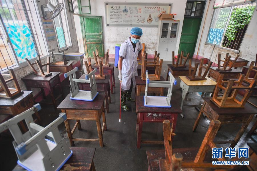6月8日,在永州市江華瑤族自治縣白芒營(yíng)鎮(zhèn)車下完全小學(xué),白芒營(yíng)中心衛(wèi)生院的工作人員在對(duì)教室進(jìn)行消毒。受近日持續(xù)強(qiáng)降雨影響,湖南省永州市江華瑤族自治縣發(fā)生洪澇災(zāi)害。6月8日,永州市江華瑤族自治縣白芒營(yíng)鎮(zhèn)車下完全小學(xué)開(kāi)展清淤、消毒工作,為6月9日恢復(fù)上課做準(zhǔn)備。新華社記者陳澤國(guó)攝