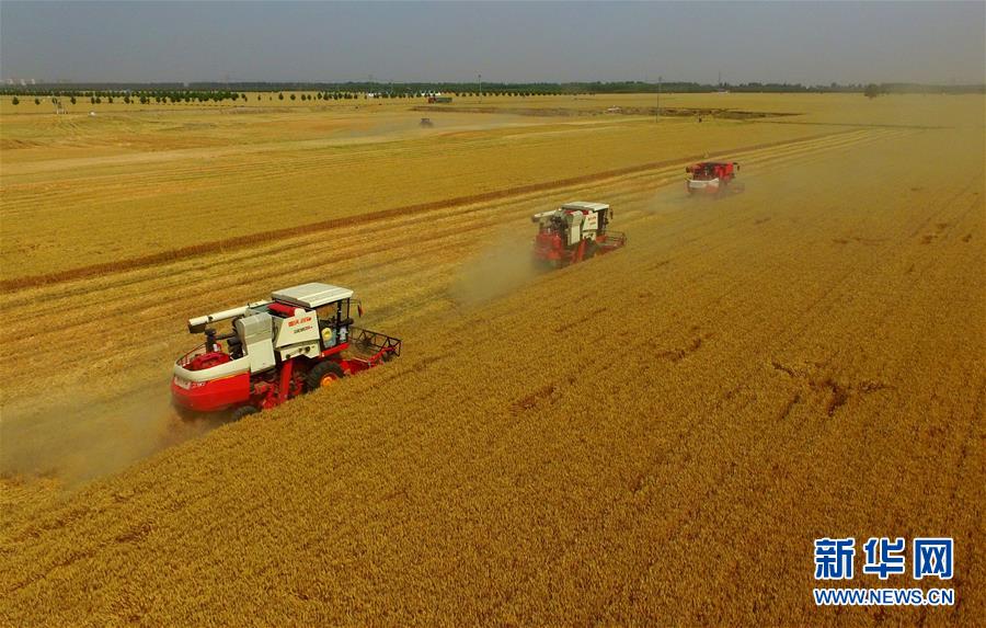 6月8日,聯(lián)合收割機(jī)在河北省南和縣閆里鄉(xiāng)閆里村麥田進(jìn)行夏收作業(yè)(無人機(jī)照片)。“三夏”期間,河北省預(yù)計(jì)組織和調(diào)度小麥聯(lián)合收割機(jī)、拖拉機(jī)、夏玉米播種機(jī)等200萬臺(tái)農(nóng)業(yè)機(jī)械投入作業(yè)。新華社記者朱旭東攝