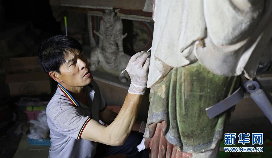 6月8日,工作人員對奉國寺的彩繪泥塑進行保護修復(fù)。新華社記者姚劍鋒攝