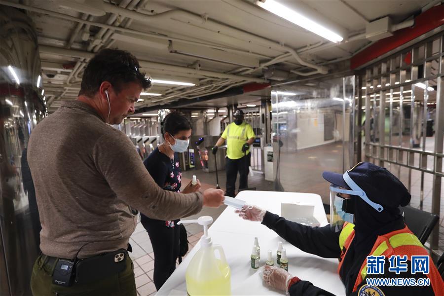6月8日,在美國紐約,地鐵工作人員為乘客發(fā)放洗手液和口罩。在因新冠疫情進入“居家令”近三個月之后,美國紐約市于當?shù)貢r間8日開始“解封”,進入經(jīng)濟重啟的第一階段。新華社記者王迎攝