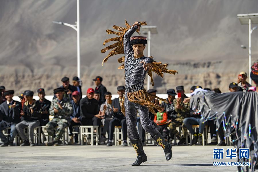 在熱斯喀木村,新疆塔什庫爾干塔吉克自治縣文工團演員為村民表演國家級非物質(zhì)文化遺產(chǎn)——塔吉克族鷹舞(6月6日攝)。新華社記者胡虎虎攝