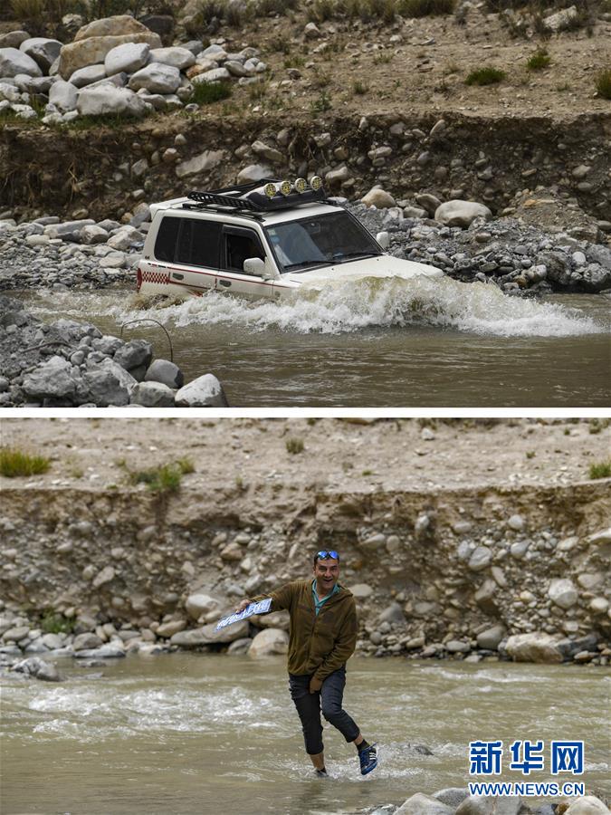 拼版照片:上圖為新疆塔什庫(kù)爾干塔吉克自治縣文工團(tuán)的車輛通過(guò)一處涉水路段,前往熱斯喀木村演出;下圖為一名文工團(tuán)演員從水里撿起車輛過(guò)河時(shí)被沖掉的車牌(6月5日攝)。新華社記者胡虎虎攝