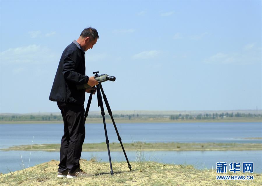 6月9日,鄂爾多斯遺鷗國家級自然保護區(qū)東勝管理站站長任永奇,用望遠鏡觀察泊江海子鳥類生活情況。近年來,在當?shù)卣亩喾N措施治理下,曾經(jīng)水面萎縮的內蒙古自治區(qū)鄂爾多斯市境內的泊江海子水量逐漸恢復。近期,包括遺鷗在內的40多種鳥類來此棲息,泊江海子重新成為鳥類的樂園。新華社記者賈立君攝