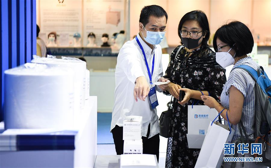 6月10日,一名參展商(左)向采購商講解口罩生產(chǎn)原料及工藝。當(dāng)日,廣州國際防疫物資展覽會(huì)在保利世貿(mào)博覽館舉行。本次展會(huì)面積共計(jì)3.6萬平方米,設(shè)有防疫產(chǎn)品、設(shè)備、綜合服務(wù)、原輔料等4個(gè)展區(qū),參展企業(yè)約600家。新華社記者鄧華攝
