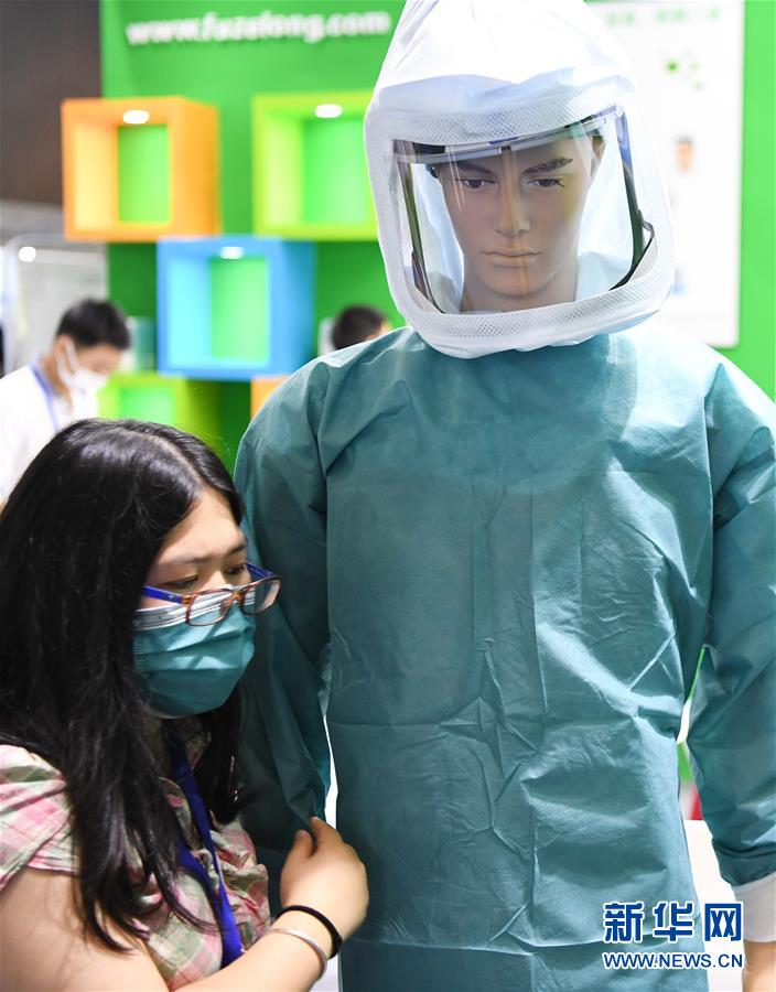 6月10日,參展工作人員站在一臺(tái)KN95口罩生產(chǎn)設(shè)備旁。當(dāng)日,廣州國際防疫物資展覽會(huì)在保利世貿(mào)博覽館舉行。本次展會(huì)面積共計(jì)3.6萬平方米,設(shè)有防疫產(chǎn)品、設(shè)備、綜合服務(wù)、原輔料等4個(gè)展區(qū),參展企業(yè)約600家。新華社記者鄧華攝