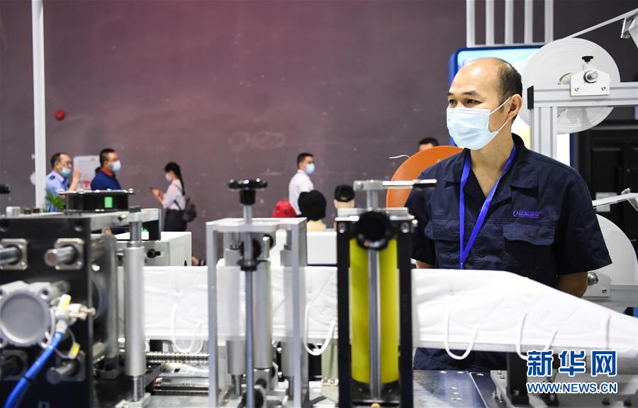 6月10日,參展工作人員站在一臺(tái)KN95口罩生產(chǎn)設(shè)備旁。當(dāng)日,廣州國(guó)際防疫物資展覽會(huì)在保利世貿(mào)博覽館舉行。本次展會(huì)面積共計(jì)3.6萬平方米,設(shè)有防疫產(chǎn)品、設(shè)備、綜合服務(wù)、原輔料等4個(gè)展區(qū),參展企業(yè)約600家。新華社記者鄧華攝