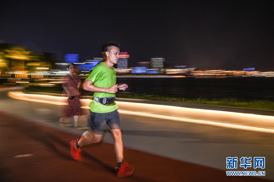一位市民在??谑兰o公園濱海步道夜跑(5月15日拍攝)。近年來,夜跑成為越來越多都市人熱衷的健身方式之一。在海南???,每當夜幕降臨,“夜跑族”來到??谌f綠園、世紀公園等夜跑場所跑步,用一身酣暢淋漓的汗水擺脫白天工作中的壓力,享受跑步帶來的歡愉。新華社記者 蒲曉旭 攝