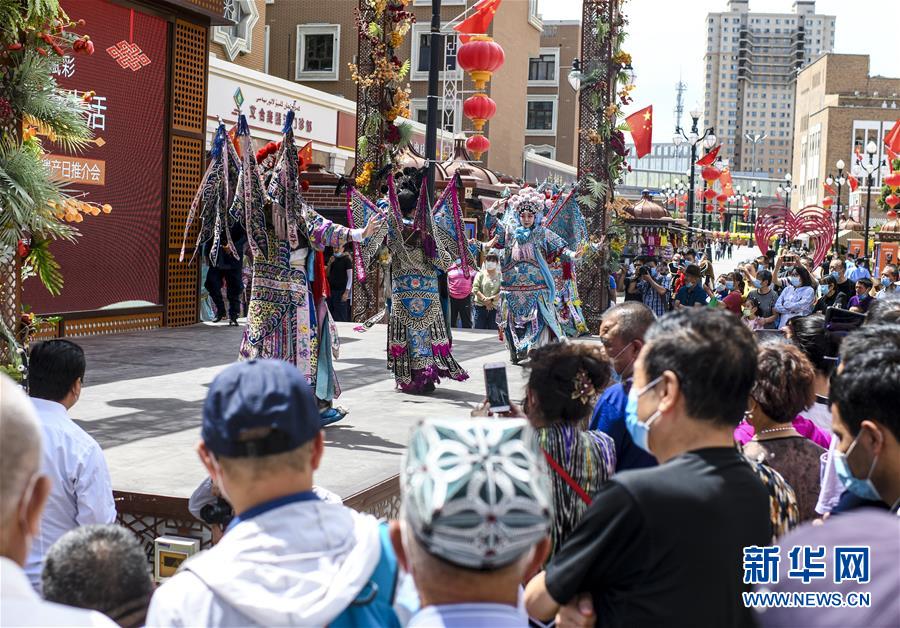 6月12日,在位于烏魯木齊大巴扎景區(qū)內(nèi)的活動(dòng)現(xiàn)場,烏魯木齊秦劇團(tuán)的演員在表演國家級(jí)非物質(zhì)文化遺產(chǎn)——秦腔。6月12日,“文旅融合,文物賦彩,非遺傳承,健康生活”2020年烏魯木齊市天山區(qū)文化和自然遺產(chǎn)日推介展演活動(dòng)在大巴扎景區(qū)舉辦,吸引不少游客和市民觀賞。新華社記者王菲攝。