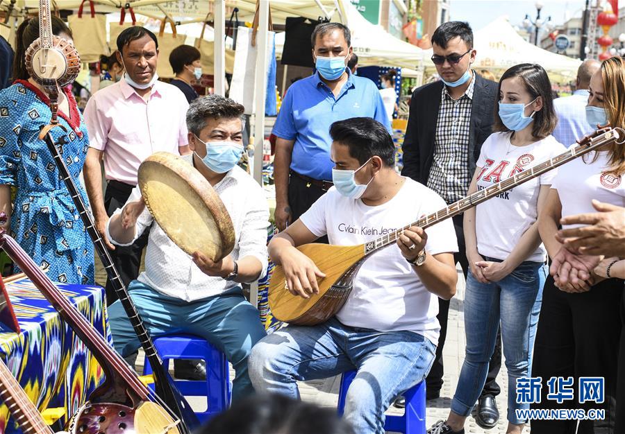 6月12日,在位于烏魯木齊大巴扎景區(qū)內(nèi)的活動(dòng)現(xiàn)場,新疆維吾爾自治區(qū)非物質(zhì)文化遺產(chǎn)傳承人艾爾肯·吐么爾(左)在“維吾爾族樂器制作技藝”非遺項(xiàng)目展區(qū)演奏都塔爾。6月12日,“文旅融合,文物賦彩,非遺傳承,健康生活”2020年烏魯木齊市天山區(qū)文化和自然遺產(chǎn)日推介展演活動(dòng)在大巴扎景區(qū)舉辦,吸引不少游客和市民觀賞。新華社記者王菲攝。