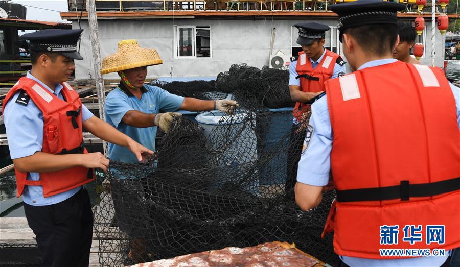 6月13日,海南省公安廳海岸警察總隊(duì)(籌備組)陵水支隊(duì)民警幫助轄區(qū)內(nèi)漁民整理漁網(wǎng)。當(dāng)日,海南省氣象局于16時(shí)30分繼續(xù)發(fā)布臺(tái)風(fēng)四級(jí)預(yù)警。今年第2號(hào)臺(tái)風(fēng)“鸚鵡”(熱帶風(fēng)暴級(jí))預(yù)計(jì)于14日在廣東沿海登陸。新華社記者楊冠宇攝。