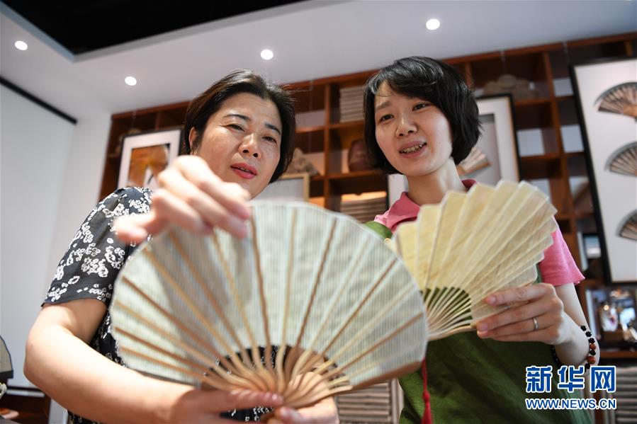 6月12日,非遺傳承人馬仁芬(左)與馬琳沁在探討夏布折扇的創(chuàng)新設(shè)計。新華社記者 唐奕 攝