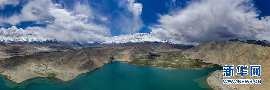 帕米爾高原上喀拉庫(kù)勒湖畔連綿的雪山(6月16日攝,無(wú)人機(jī)全景照片)。新華社記者 胡虎虎 攝