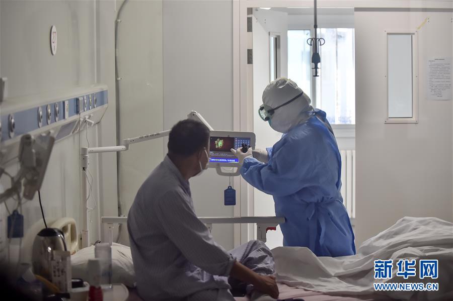 6月16日,在北京地壇醫(yī)院隔離病房?jī)?nèi),護(hù)士幫助患者調(diào)整電視。新華社記者 彭子洋 攝