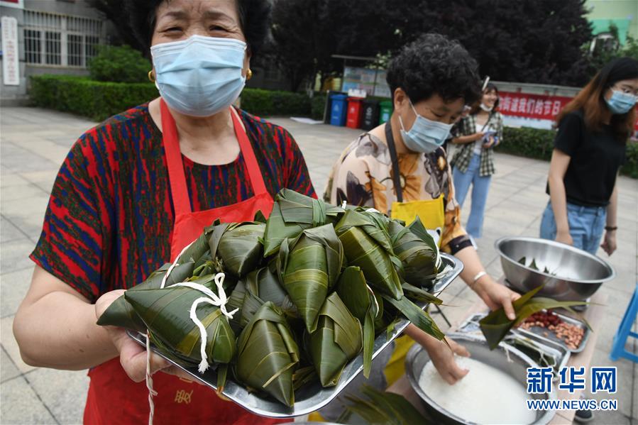 6月17日,水清溝街道居民在社區(qū)廣場上包粽子。新華社記者 李紫恒 攝