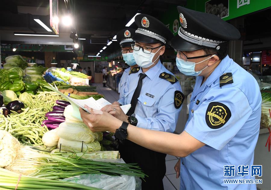 6月17日,在位于北京市海淀區(qū)的增光鴻運市場,執(zhí)法人員對商戶所售蔬菜的進貨渠道進行檢查。新華社記者 任超 攝
