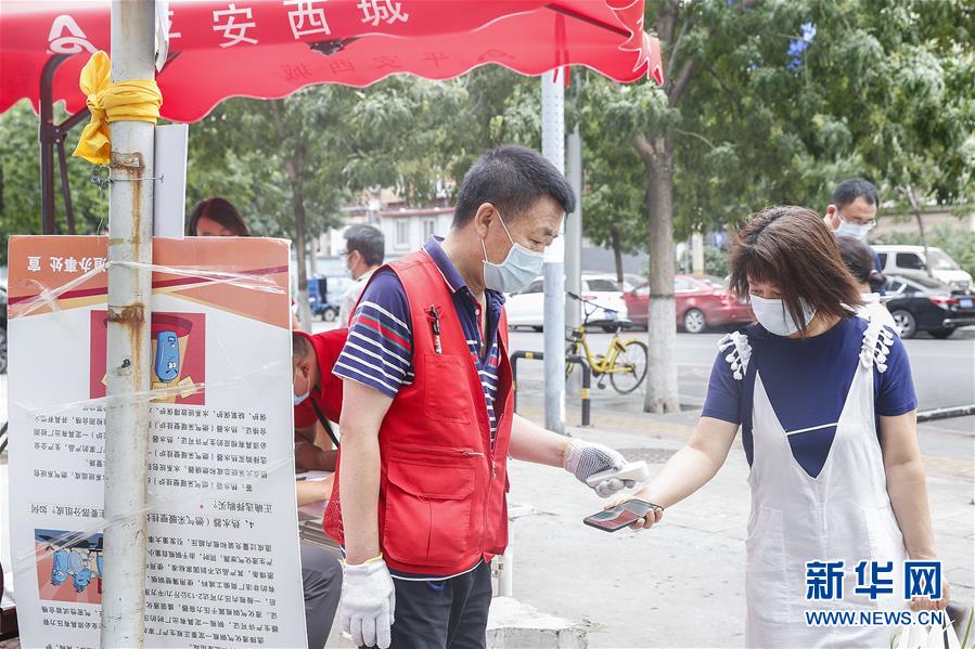 6月17日,居民在北京市西城區(qū)廣外街道小馬廠東社區(qū)的入口測(cè)量體溫。新華社記者 張玉薇 攝