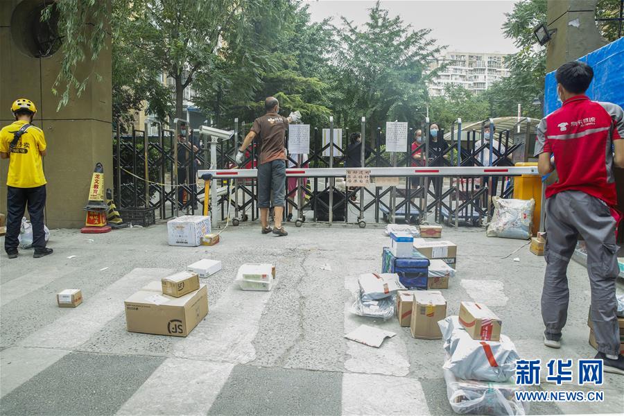 6月17日,快遞員在北京市西城區(qū)廣外街道朗琴園社區(qū)外為一位居民遞送包裹。