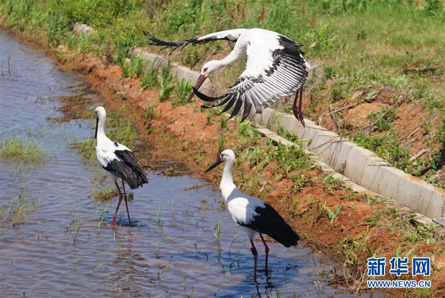 6月17日,三只東方白鸛從籠中飛出。新華社記者 周密 攝