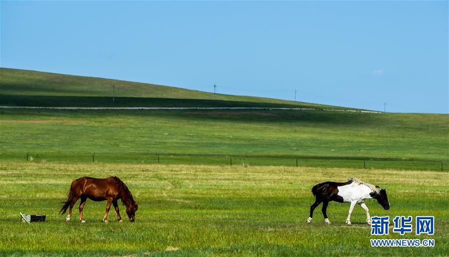 6月17日,馬兒在錫林郭勒盟烏拉蓋草原上吃草。初夏時(shí)節(jié),內(nèi)蒙古中部的錫林郭勒大草原風(fēng)景如畫。新華社記者連振攝