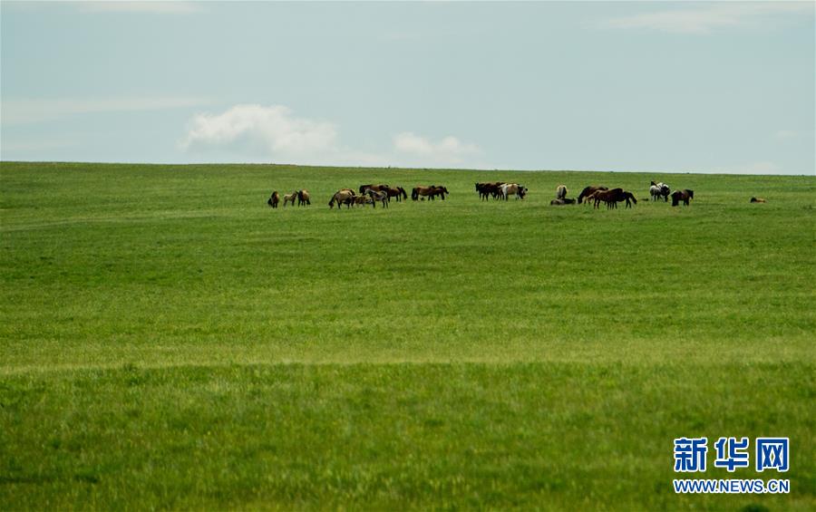 6月18日,馬群在錫林郭勒盟西烏珠穆沁草原上吃草。初夏時(shí)節(jié),內(nèi)蒙古中部的錫林郭勒大草原風(fēng)景如畫。新華社記者連振攝