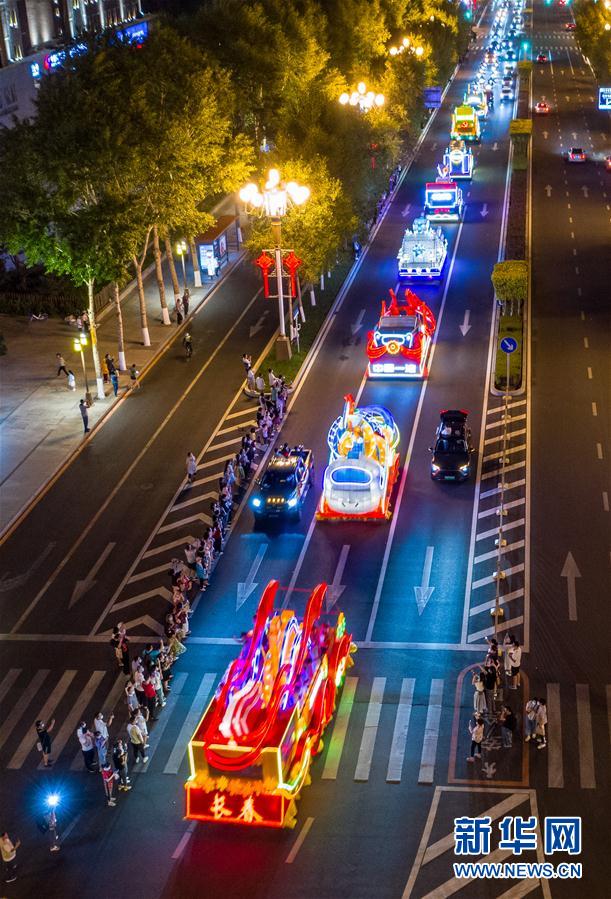 6月19日,花車在長春市人民大街上巡游(無人機照片)。新華社記者張楠攝