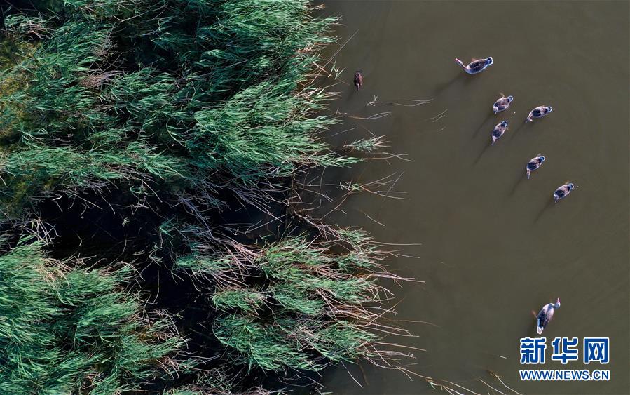 6月19日,一群鴨子在新疆烏倫古湖國家濕地公園覓食(無人機照片)。烏倫古湖國家濕地公園位于新疆阿勒泰地區(qū)福??h城以西,由烏倫古湖和吉力湖兩部分組成。烏倫古湖濕地公園是遷徙候鳥飛越天山和阿爾泰山的“能量補充站”,良好的濕地生態(tài)吸引著大量遷徙鳥類在此集結(jié)成群,繁殖棲息,成為一道靚麗的風(fēng)景線。新華社記者 沙達提 攝