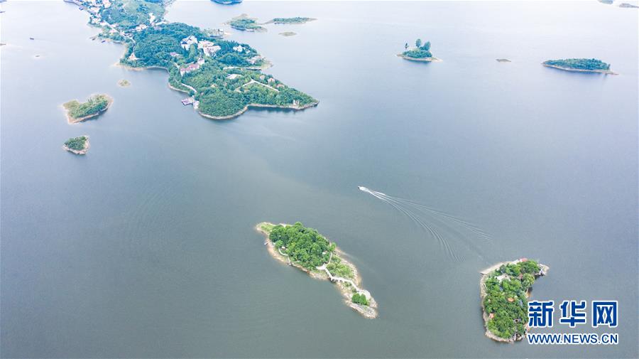 6月21日,游客乘船在紅楓湖景區(qū)游覽(無人機照片)。夏至時節(jié),貴州省清鎮(zhèn)市紅楓湖景區(qū)草木蒼翠,秀麗的湖光山色吸引不少游客前來游玩。新華社記者陶亮攝