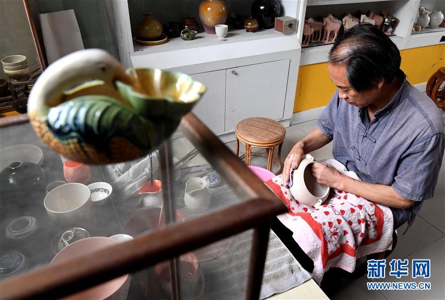 在河南省鞏義市站街鎮(zhèn)小黃冶村的工作室里,游光明在施釉前對器物進行打磨(6月19日攝)。新華社記者李安攝