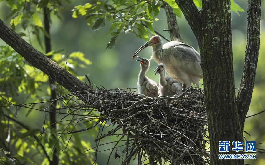 在陜西省漢中市洋縣四郎鎮(zhèn)田嶺村的一片密林里,朱鹮在巢里照看幼鳥(2018年6月2日攝)。記者22日從陜西省林業(yè)局了解到,據(jù)不完全統(tǒng)計(jì),曾幾近滅絕的朱鹮,其全球種群數(shù)量已超過5000只,其中中國(guó)境內(nèi)4400只,棲息地呈現(xiàn)出以秦嶺為中心向東亞歷史分布地?cái)U(kuò)展的趨勢(shì)。新華社記者陶明攝
