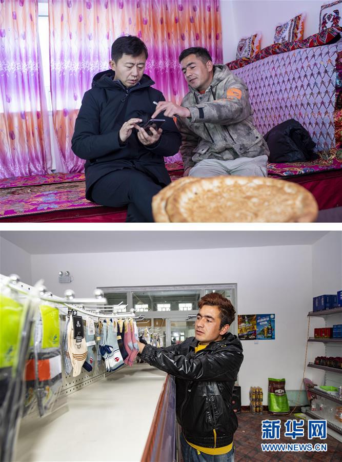 拼版照片:上圖為新疆塔什庫(kù)爾干塔吉克自治縣扶貧工作人員付超(左)向都熱·加爾曼的小兒子征求就業(yè)創(chuàng)業(yè)意愿(2019年11月25日攝);下圖為都熱·加爾曼的小兒子通過小額貸款在易地扶貧搬遷安置點(diǎn)開辦了小商店(6月2日攝)。新華社記者胡虎虎攝