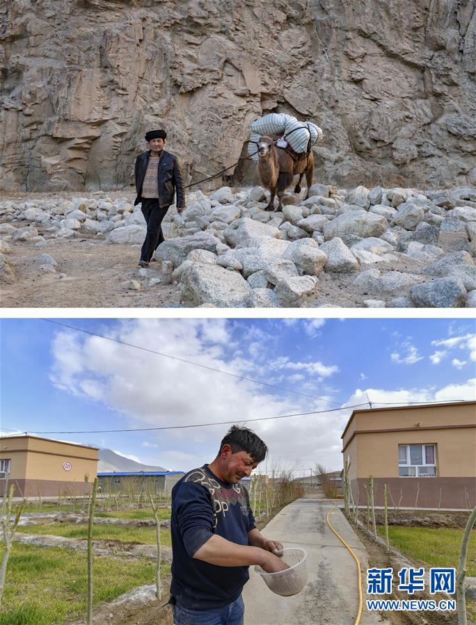 拼版照片:上圖為新疆塔什庫爾干塔吉克自治縣大同鄉(xiāng)村民都熱·加爾曼牽著馱有搬遷行李的駱駝,走在山谷中(2018年11月17日攝);下圖為都熱·加爾曼在易地扶貧搬遷安置點準(zhǔn)備播撒草籽(6月3日攝)。新華社記者胡虎虎攝