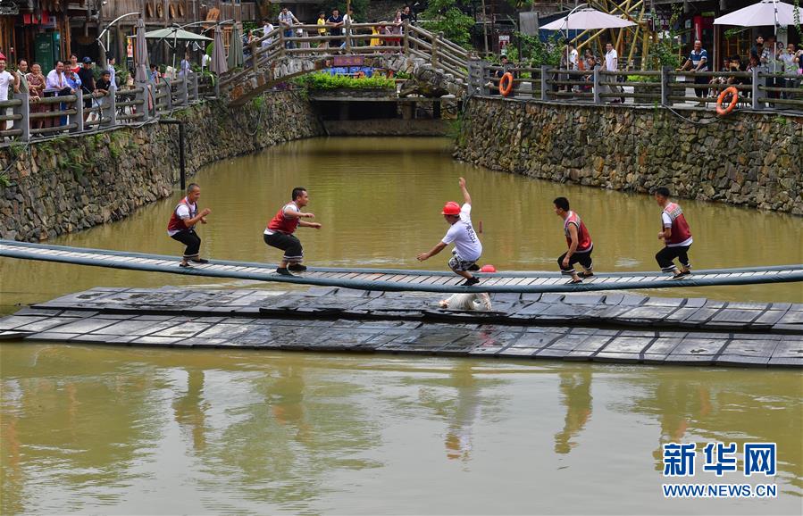 在廣西融水雙龍溝森林旅游度假區(qū)夢嗚苗寨,幾位搬遷戶協(xié)助游客挑戰(zhàn)“搖擺橋”(6月21日攝)。近年來,融水打造原生態(tài)苗族文化體驗(yàn)園——夢嗚苗寨,讓搬遷進(jìn)城的貧困戶住進(jìn)復(fù)原建設(shè)的老房子。景區(qū)提供綠化保潔、游樂設(shè)施管理、民族歌舞表演等工作崗位,多渠道增加貧困戶收入。