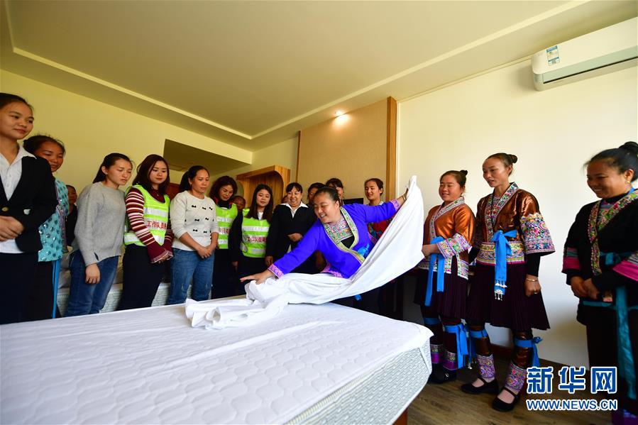 在廣西融水苗族自治縣香粉鄉(xiāng)雨卜村,扶貧工作隊(duì)員和致富帶頭人在學(xué)習(xí)客房服務(wù)技能(2019年11月4日攝)。新華社記者黃孝邦攝