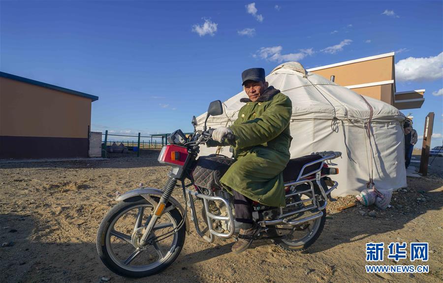 在吉木乃縣萬駝園內,傍晚時分,牧民米拉木別克·阿依提克準備騎著摩托車將駱駝趕回圈內(6月21日攝)。新華社記者趙戈攝