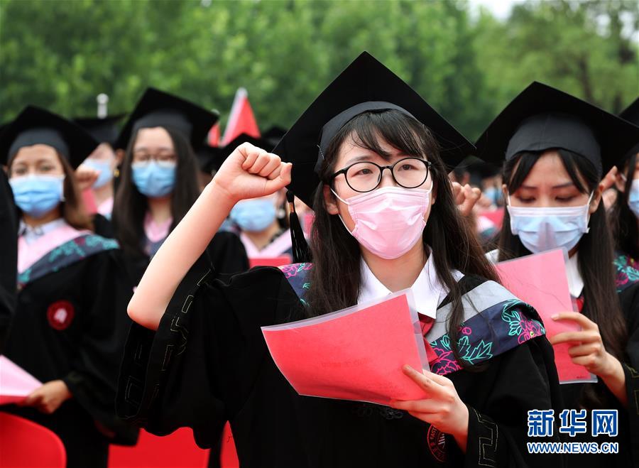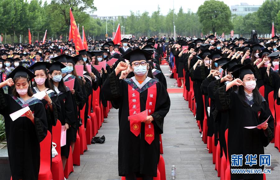 6月23日,在華東師范大學閔行校區(qū)的畢業(yè)典禮上,師范專業(yè)的畢業(yè)生舉行宣誓儀式。當日,華東師范大學舉行2020屆畢業(yè)典禮。由于疫情防控需要,今年的典禮在兩個校區(qū)分別舉辦,并全程在線直播。約7700名華東師范大學2020屆畢業(yè)生通過現(xiàn)場或“云端”的方式參加畢業(yè)典禮。新華社記者劉穎攝