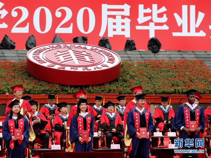 6月23日,在華東師范大學(xué)閔行校區(qū)的畢業(yè)典禮上,優(yōu)秀畢業(yè)生代表接受表彰。當(dāng)日,華東師范大學(xué)舉行2020屆畢業(yè)典禮。由于疫情防控需要,今年的典禮在兩個校區(qū)分別舉辦,并全程在線直播。約7700名華東師范大學(xué)2020屆畢業(yè)生通過現(xiàn)場或“云端”的方式參加畢業(yè)典禮。新華社記者劉穎攝