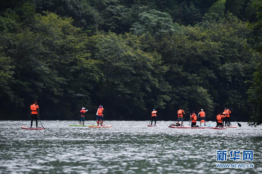 6月28日,水上運(yùn)動(dòng)愛好者在杭州市富陽區(qū)湖源鄉(xiāng)的壺源溪上體驗(yàn)槳板運(yùn)動(dòng)的樂趣。近期,浙江省杭州市富陽區(qū)場(chǎng)口鎮(zhèn)、常安鎮(zhèn)和湖源鄉(xiāng)組團(tuán)開啟了一場(chǎng)夏季“綠水青山嘉年華”。這幾個(gè)壺源溪流域鄉(xiāng)鎮(zhèn)整合生態(tài)旅游資源,組團(tuán)開發(fā)山村旅游項(xiàng)目,游客可以參與壺源溪水上游樂、露營永安山頂、特色農(nóng)產(chǎn)品集市和瓜果節(jié)等特色活動(dòng)。新華社記者徐昱攝