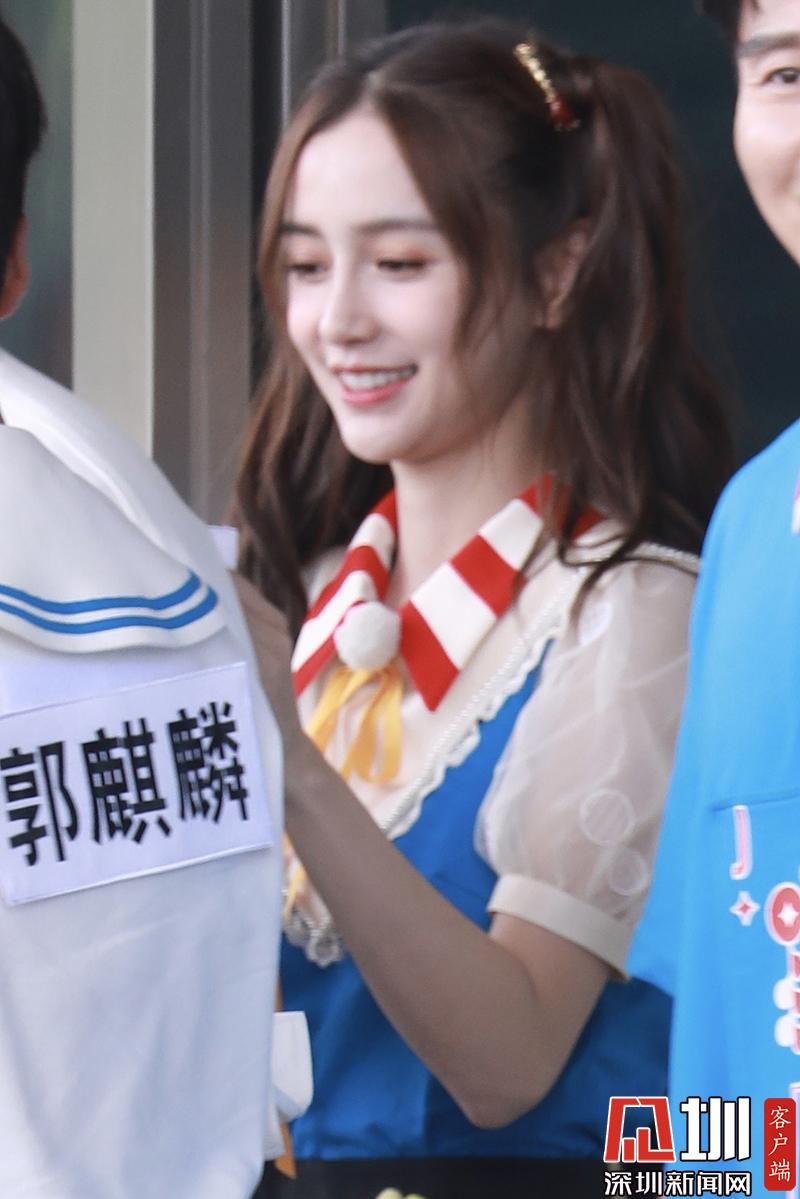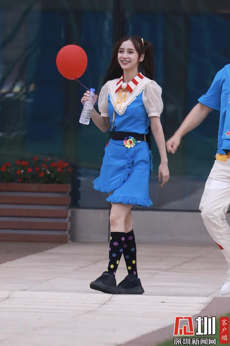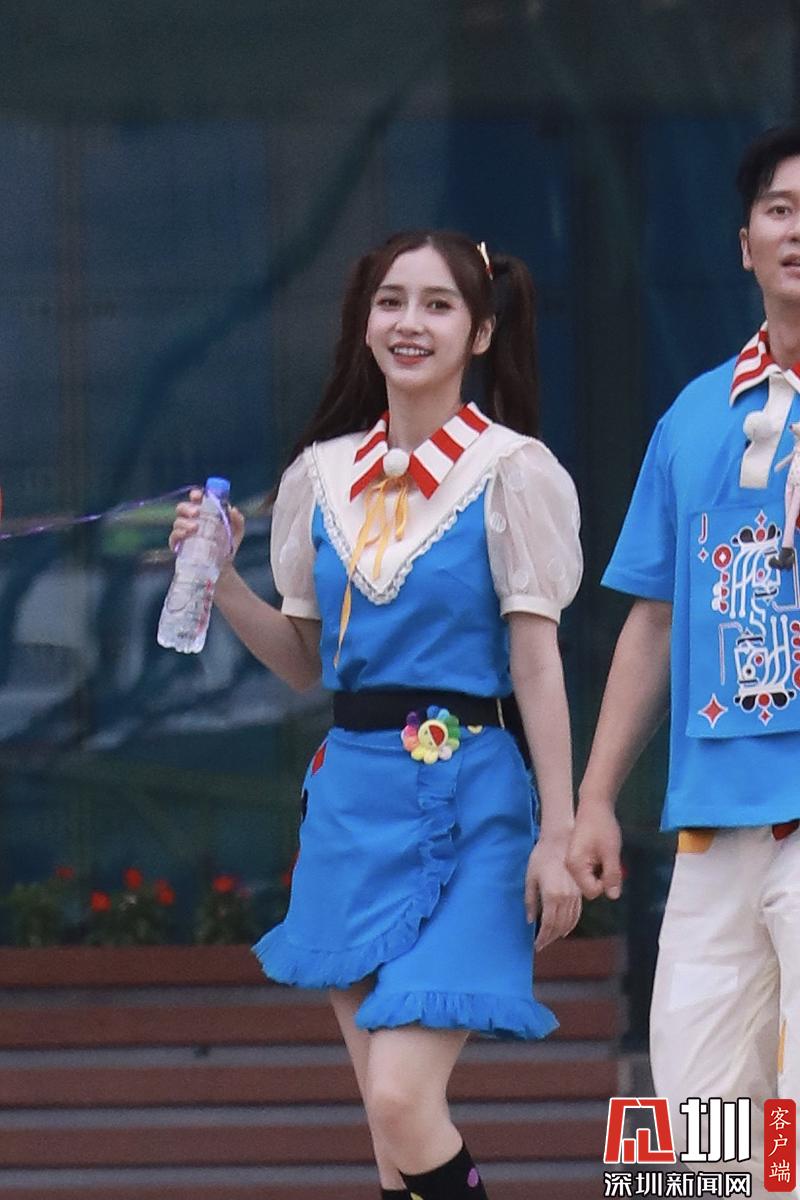 楊穎(angelababy)穿藍(lán)色背帶裙扎雙馬尾清新可愛